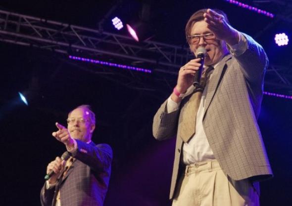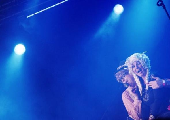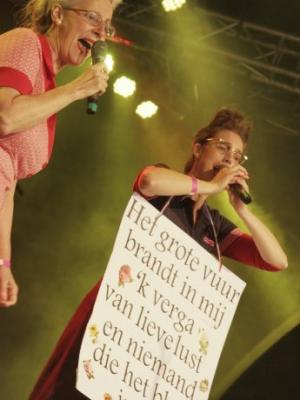 Terug naar de meezingers, de Jantina's al drie jaar op rij bij ons op visite. Dit keer met hun eigen woonkamer op het podium, honkvast als ze zijn. Volgend jaar ook een badkamer mee?