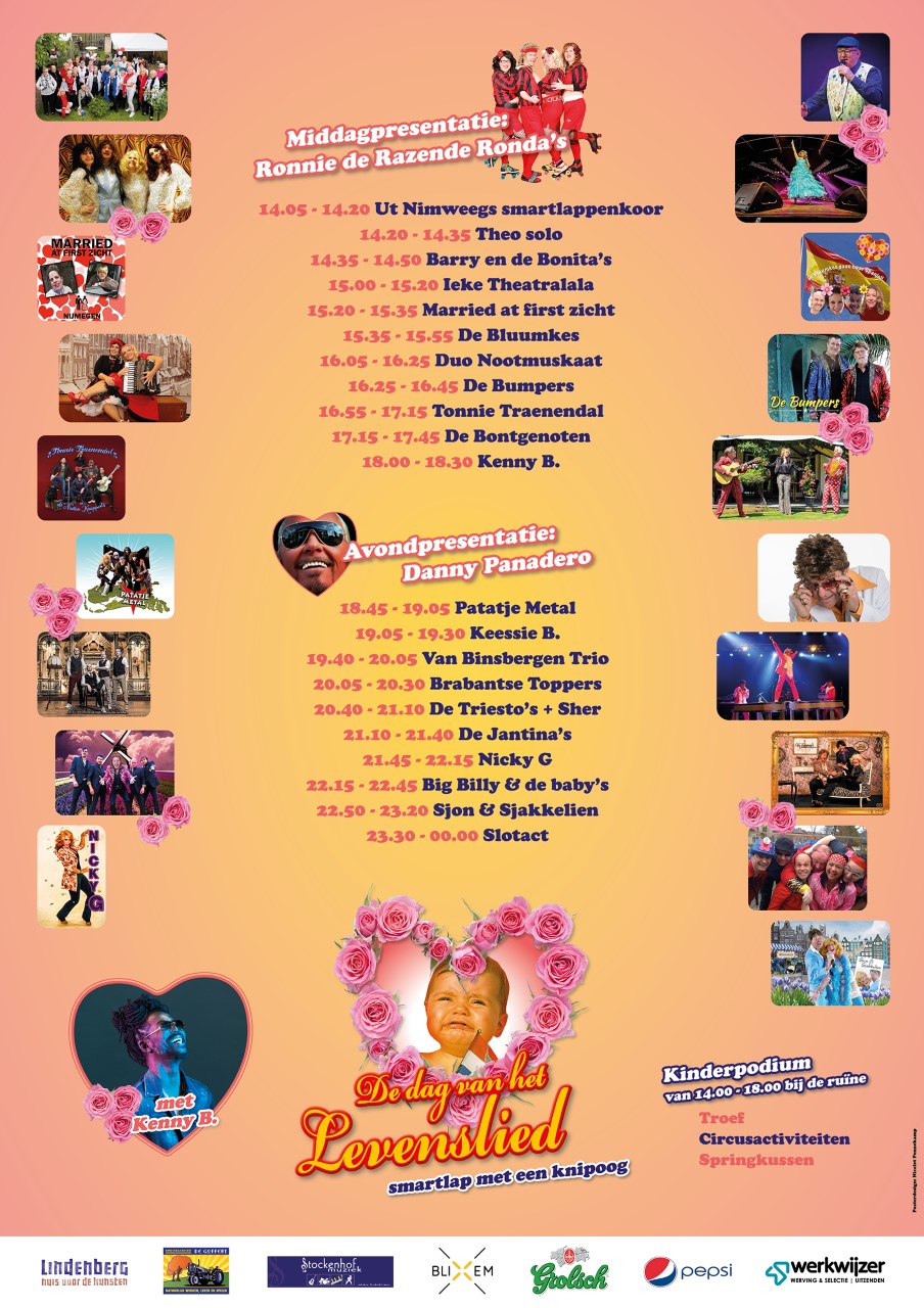 Het is dan alweer drie jaar na de laatste keer dat we elkaar zagen in het Valkhofpark. Wat denken jullie? Kunnen jullie het nog? Schouder aan schouder meezingen met de fijnste smartlappen? Wij doen ons best er weer een prachtige dag van te maken! Met van 14.00-24.00 uur de grootste tranentrekkers, veel humor, aanstekelijke presentatoren, een speciaal kinderprogramma en natuurlijk een geheime slotact.